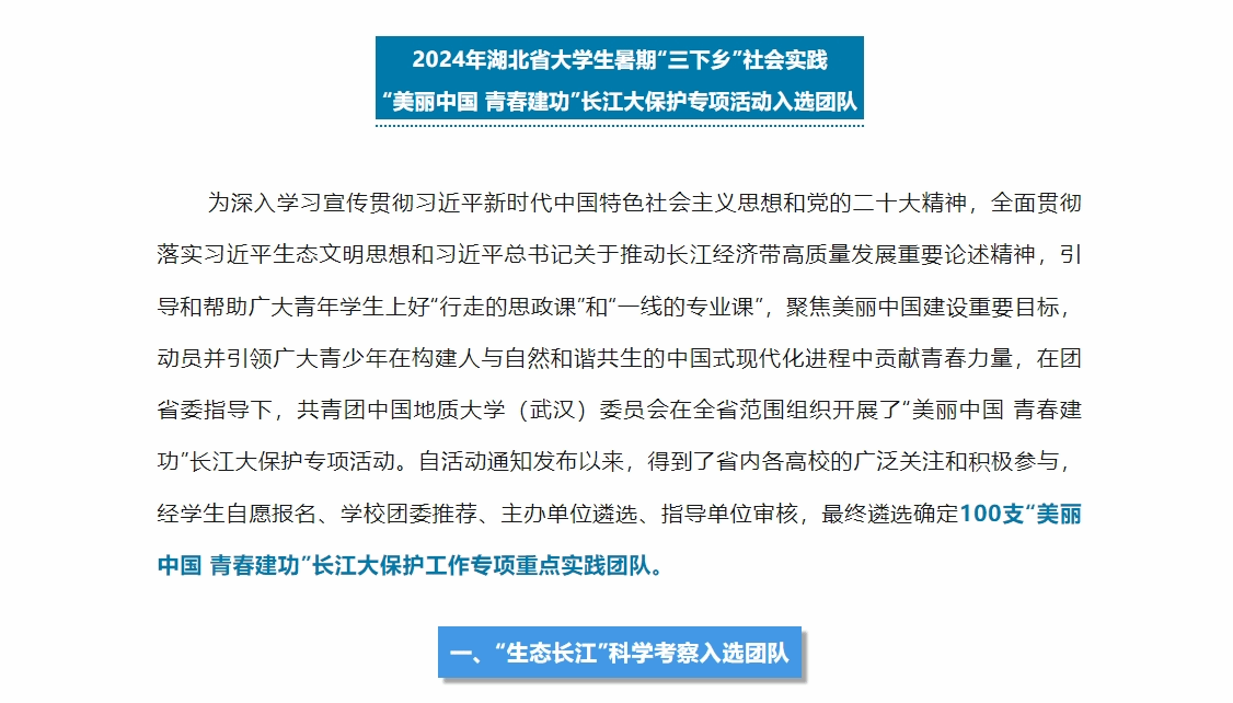 为深入学习宣传贯彻习近平新时代中国特色社会主义思想和党的二十大精神,全面贯彻落实习近平生态文明思想和习近平总书记关于推动长江经济带高质量发展重要论述精神,引导和帮助广大青年学生上好“行走的思政课”和“一线的专业课”,近日,由文化和旅游部市场管理司、教育部思想政治工作司、共青团中央青年发展部联合举办的“‘以青春之名 行文明之旅’——2024年全国大学生文明旅游暑期实践活动”和由团湖北省委指导、中国地质大学(武汉)团委组织的“‘美丽中国 青春建功’长江大保护专项活动”陆续公布了立项名单,我院研究生暑期社会实践团队“清流护卫队”分别入选。