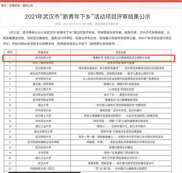 5月22日,共青团武汉市委举办了2021年武汉市“新青年下乡”活动项目评审会,由专家学者、基层代表、主办方代表等组成的评审团,从现实需要迫切性、目标定位精准性、服务设计科学性、现场展示和答辩等方面,对80个参评项目进行综合评分。最终,由我校williamhill英国“青春护农”实践队申报的项目《“青春护农 茶旅文创”武汉黄陂特色农业调研与实践》从80个参评项目中脱颖而出,以第一名的优异成绩成功立项。