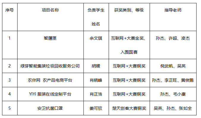 本届大赛由湖北省教育厅、省统战部、省网信办、省发改委、省经信委、省人社厅、省农村农业厅、省知识产权局、省扶贫办及团省委等十部门主办,湖北工业大学承办,中国建设银行湖北省分行冠名支持,赛链云平台提供技术服务支持。来自全省84所学校188个项目进行省赛现场决赛,最终,在我院领导的高度重视和一批优秀教师的辛勤指导下,共获得金奖1项,铜奖3项的优异成绩;同时,还举行了湖北省第三届“我梦见——楚天创客”大赛,我院有1个项目获得铜奖,据统计,我院获奖数量及成绩在学校名列前茅,具体名单如下: