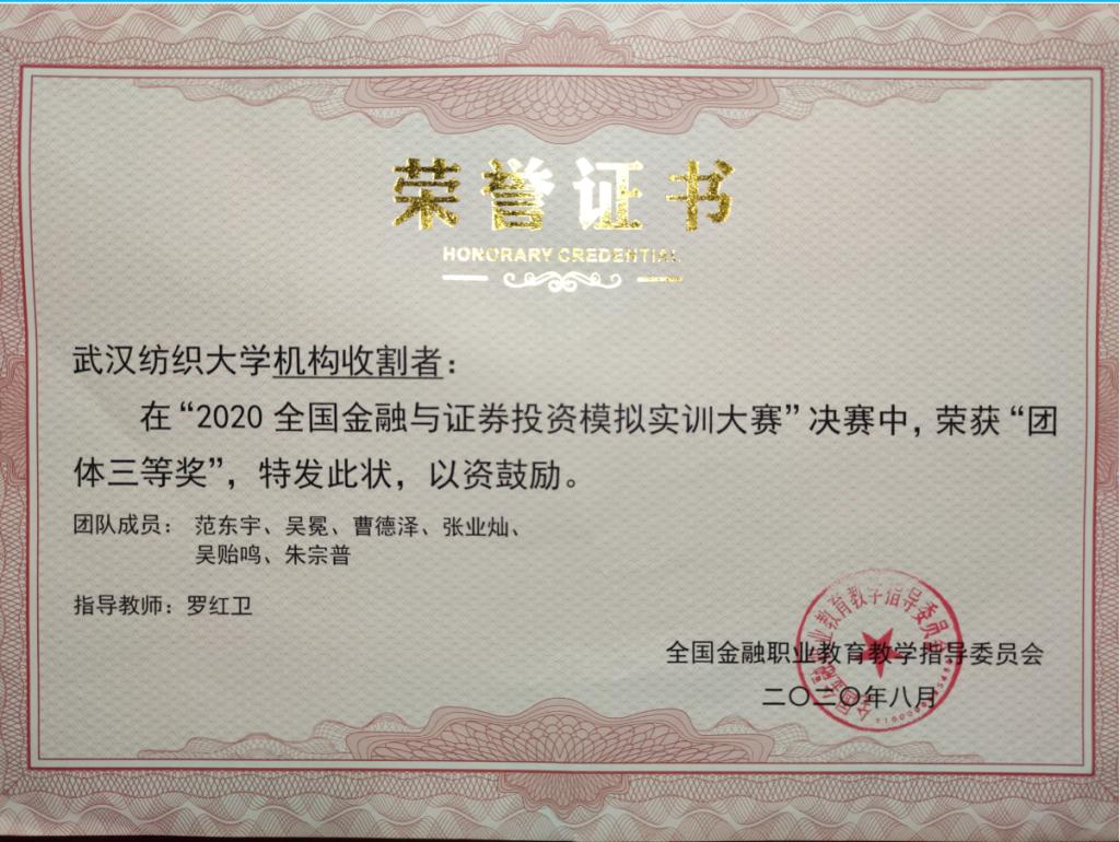 近日,由全国金融职业教育教学指导委员会主办,深圳希施玛数据科技有限公司承办,中国财经数据创新研究院协办的2020全国金融与证券投资模拟实训大赛落下帷幕。williamhill英国组成的学生团队“纺大队”和“机构收割者队”,在罗红卫老师的指导下,经过激烈角逐,在决赛中荣获团体一等奖、三等奖。