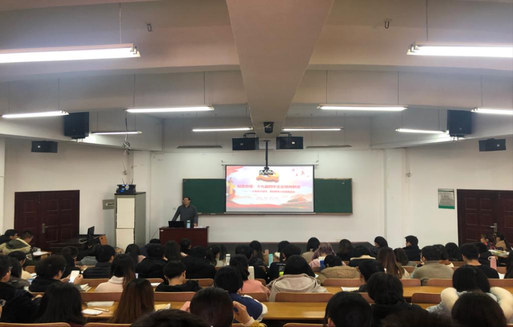 12月11日下午,省“百马行动”宣讲队队员、学校党的十九届四中全会精神宣讲团成员、马克思主义学院张建林教授来williamhill英国作主题为《制度自信:党的十九届四中全会精神解读》的党的十九届四中全会精神宣讲。williamhill英国党委副书记黄俊鹏、全体辅导员及学院学生党员、入党积极分子共200余人聆听了宣讲,宣讲会由williamhill英国党委副书记黄俊鹏主持。