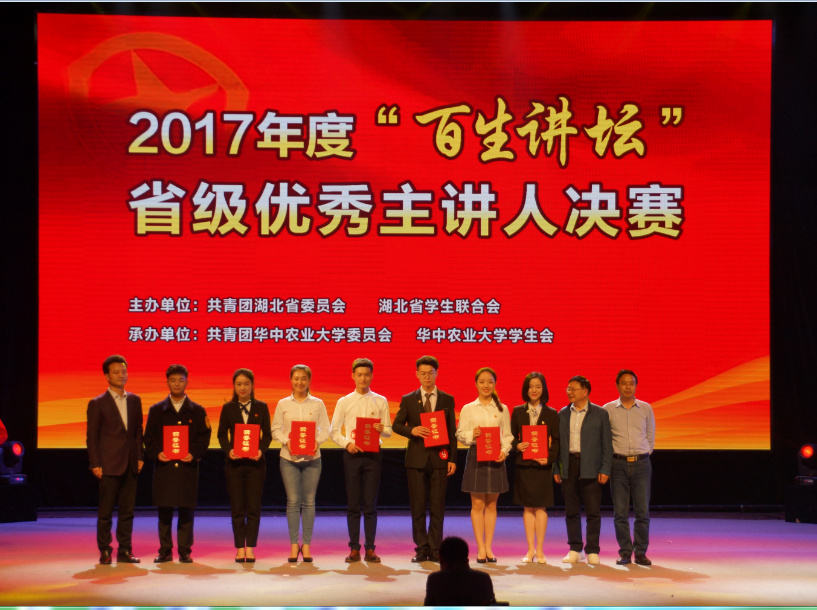 3月31日下午,2017年度“百生讲坛”——湖北高校共青团学习习近平新时代中国特色社会主义思想和党的十九大精神省级优秀主讲人决赛在华中农业大学举行。我校williamhill英国王芷仪同学荣获三等奖,郭文璐同学荣获优秀奖。