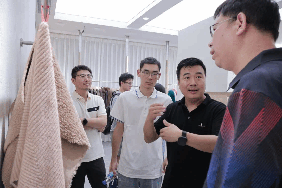 相隔不远的和利达环保皮草档口,更像一间“植物实验室”:一排玻璃瓶装着甘蔗渣、玉米须、咖啡渣在柜前展示。公司总经理蔡纯涛拎起一件“咖啡棕”仿皮草,向我们介绍起他的产品:“我们所看到的这些皮草,原料基本是可再生植物纤维,而非传统的动物皮革”。通过新型产品技术,推动纺织品向高精尖方向发展,让“可持续”与“快时尚”不再矛盾,以满足消费者高品质需求。随后,实践队还调研铭众纺织公司、增立纺织公司、兴隆纺织科技公司、嘉艺面料展厅等,了解企业规模、市场定位、历史沿革、产品技术等内容。
