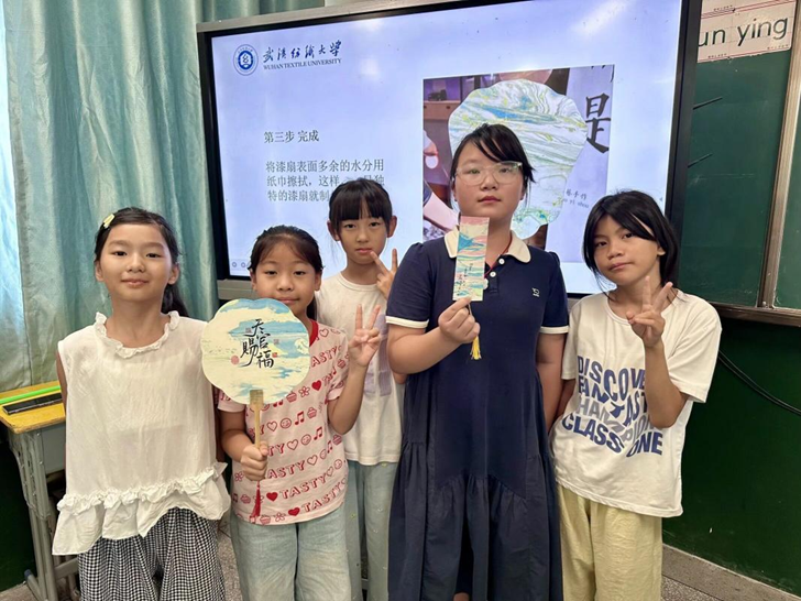 “汉绣不仅是一种技艺,更是一种文化的传承……”支教队员以生动的语言讲述了汉绣的起源、发展历程及其在传统文化中的重要地位。通过展示汉绣工艺品和播放汉绣宣传视频,孩子们更深入地了解了汉绣文化,感受其蕴含的匠心与智慧。在手工剪纸环节,孩子们在知晓剪纸的历史由来后,热情高涨,纷纷拿起剪刀创作。小阮老师穿梭其间,耐心指导,鼓励大家尽情发挥想象。一把把普通的剪刀在孩子们手中舞动,剪出了蝴蝶、花朵、小动物等各种图案,教室里充满了欢声笑语。漆扇制作将本次活动推向高潮。小嘉老师详细讲解了漆扇的制作步骤,并示范了如何在扇面绘画和上色。孩子们全神贯注学习,认真绘制图案,有的选取汉绣经典花卉,有的大胆创新,让扇子成为创意与梦想的载体,现场艺术氛围浓厚。“这次活动让我看到了孩子们对传统文化的热爱,他们的眼中充满了对知识的渴望。我们希望通过这些活动,让传统文化在孩子们心中生根发芽,传承下去。”小李老师在课后感慨道。