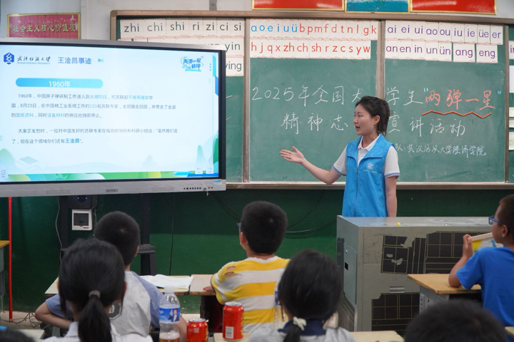 师生共同观看科研题材影片片段,科研人员让棉衣、分窝窝头的互助细节,卫星发射成功时的雀跃,原子弹爆炸蘑菇云升起的震撼,深深感染在场者,小学生随《东方红》旋律轻拍手。当屏幕上蘑菇云升起时,在场所有人自发响起掌声。正如服务队成员陆雅君所说:“对孩子而言,‘两弹一星’不是遥远的历史,而是能激发他们探索欲的火种。我们希望通过这样的活动,让科学精神与爱国情怀,成为他们成长路上的‘隐形翅膀’。