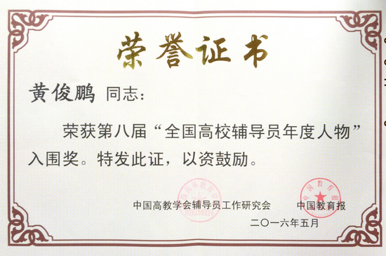 在由教育部思想政治工作司指导,中国高教学会辅导员工作研究会和中国教育报主办,新华网和中国大学生在线提供网络支持的第八届全国高校辅导员年度人物评选活动中,学院辅导员黄俊鹏老师成功入围;在2016年全国高校“活力团支部”创建遴选活动中,学院财政11402班团获全国高校“活力团支部”,该班之前还曾获校“十佳班团”一等奖。