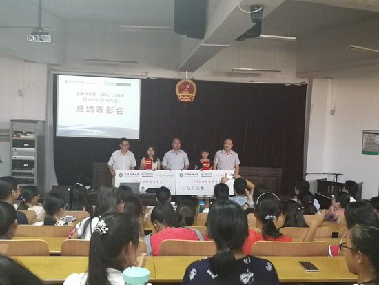 随后,williamhill英国分党委毛长文书记宣布表彰决定,授予以10门课程全优成绩通过考试的史娟、徐颖两位同学“CFA方向班优秀学员”称号,并各奖励人民币五千元;对于通过考试的吕宙等九位同学给予通报表扬,并各奖励人民币五百元。教务处同小军处长、高顿财经华中区区域总监刘锐先生上台为学生颁发奖状和奖金并合影留念。