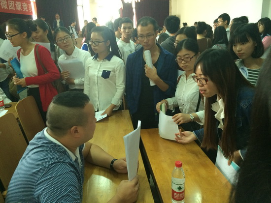 会上,湖北分公司副总经理梅雁为参会同学详细介绍了公司的基本情况、企业文化、经营业务、福利待遇等,并为大家详细解读了该公司2015年人才招聘计划及3到5年的职业发展规划,本次招聘职位有市场专员、投标专员、财务审计员等,她积极邀请、欢迎同学积极加盟公司大家庭,共同开创公司的美好未来。会后,毕业生们纷纷踊跃递交简历及咨询问题,梅总及同事积极回答了毕业生的提问,现场互动十分热烈。