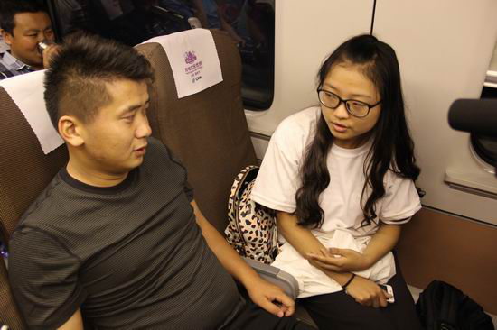 (实践队员在高铁上与乘客亲切交谈)