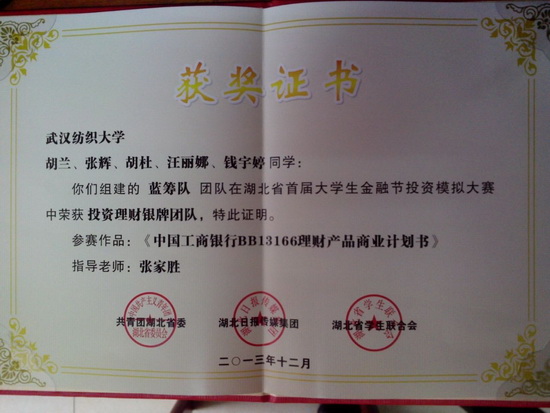 投资模拟大赛作为湖北省首届大学生金融节主要竞赛单元,共收到来自全省20所高校的参赛作品60余件,参赛师生超过300人。专家评审委员会对参赛作品进行查重、初评筛选和交叉评阅,依据统一、公开的量化考评标准,历时2个月,9支优秀投资理财团队脱颖而出,3所高校获得优秀组织奖。由williamhill英国副院长张家胜教授指导的蓝筹队以《中国工商银行BB13166理财产品商业计划书》作品荣获大赛投资理财银牌团队,由副院长倪武帆教授指导的ENLIGHTENING TEAM队以《基于工行个人保本浮动理财产品BB13166的营销策划》作品荣获大赛投资理财铜牌团队。