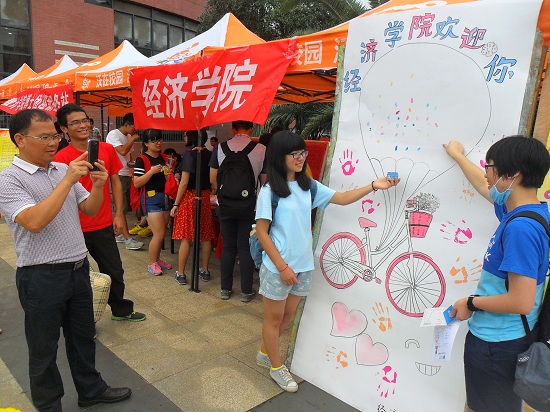 在迎新点,志愿者引导新生在画板上留下自己的手印,进行签到,所有新生的手印将组成一幅自行车上牵满气球的美丽图画。活动发起者解释道,自行车代表着不断前进的人生,彩色的气球比喻五彩斑斓的大学生活,所有同学的手印聚在一起寓意着五彩斑斓的大学生活需要和身边的同学一起创造。
