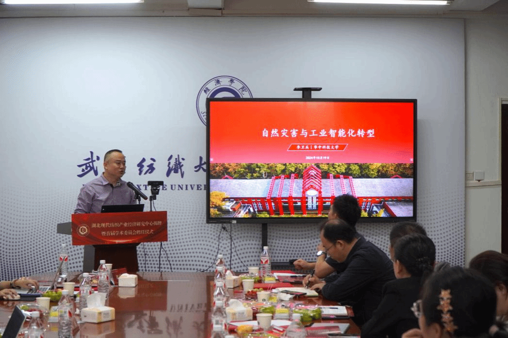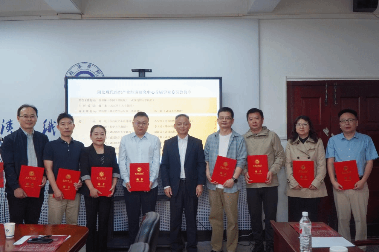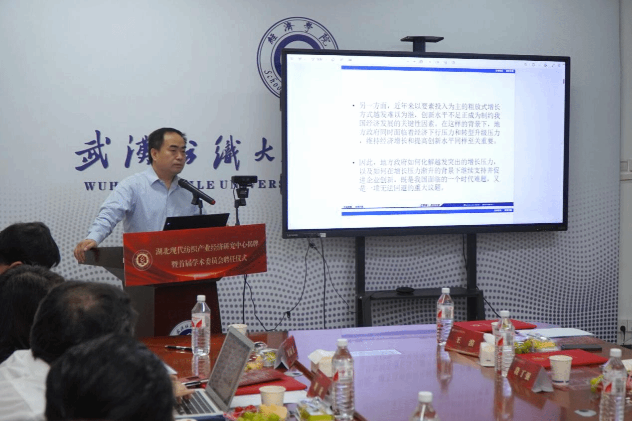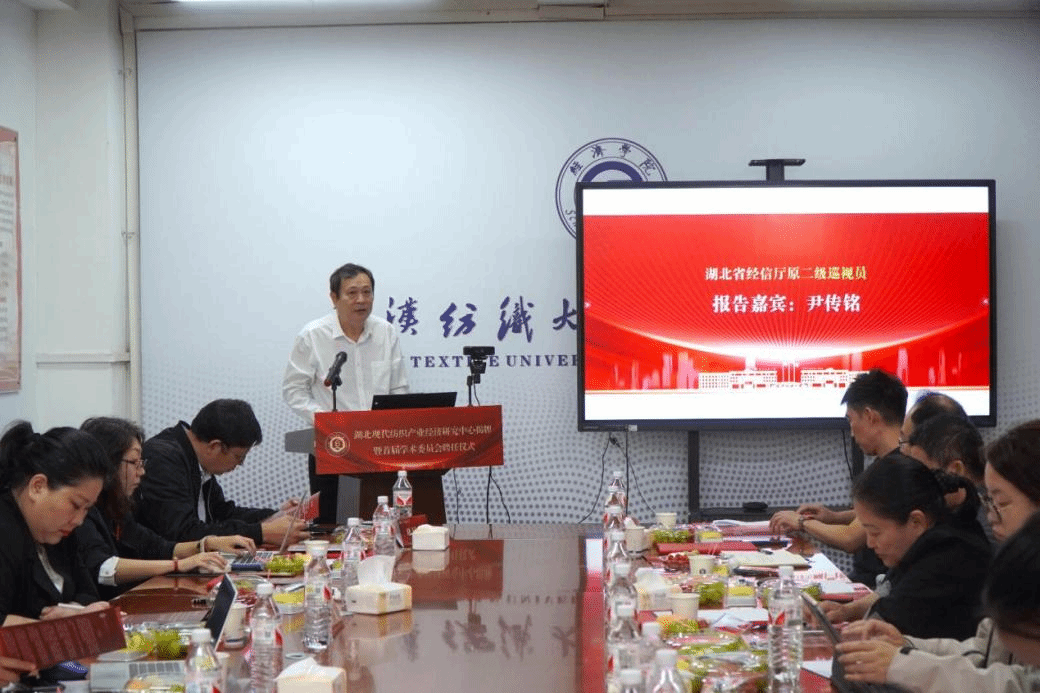 罗锦银对各位嘉宾的到来表示欢迎,他指出,获批湖北省普通高校人文社科重点研究基地“湖北现代纺织产业经济研究中心”,标志着我校在服务地方经济发展、推进产学研结合方面又迈出了坚实的一步。关于如何建好基地,他提出了三点期望,一是要建成产业发展与政策研究的高地。中心要面向纺织产业科技前沿与发展需求,加强跨学科融合,推动原创性、前瞻性、战略性研究,为纺织行业高质量发展提供高水平的学术观点与政策建议。二是要打造技术创新与成果转化的平台。中心要加强与行业企业的紧密合作,推进产学研深度融合,为企业决策提供科学依据,真正使中心成为连接学界与业界、理论与实践的重要桥梁。三是要构建为人才培养与交流合作的基地。中心要发挥专家学者的人才资源优势,形成“学科带头人+核心成员+创新团队”的学术梯队。推动产业链、创新链、人才链深度融合,促进学者型人才向智库型人才转变,为人才培养打造一支学术素养高、科研成果优、既懂专业又通产业的高水平师资队伍。