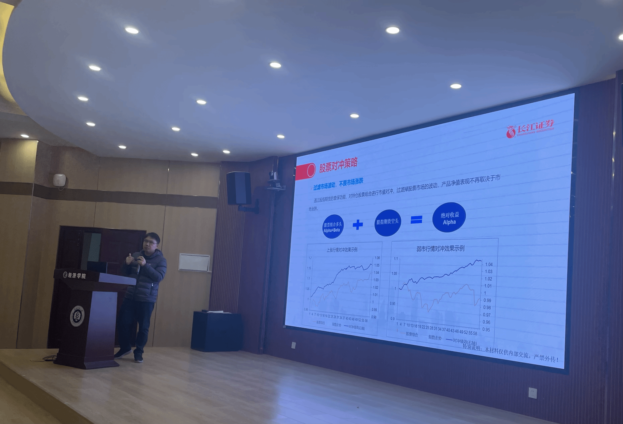 秦昌贵总经理还通过Python实战演练为同学们清晰的演示了Python在量化投资中的具体应用,秦总经理简要给出基于小容量化平台的量化策略编写环境及回测结果展示。与此同时,秦总经理以众多生动案例向我们展示了小容量化平台策略回测结果,让同学们更加清晰直观的感受到量化投资的魅力。随后秦总经理对股票的对冲及高频交易策略展开详细讲解。