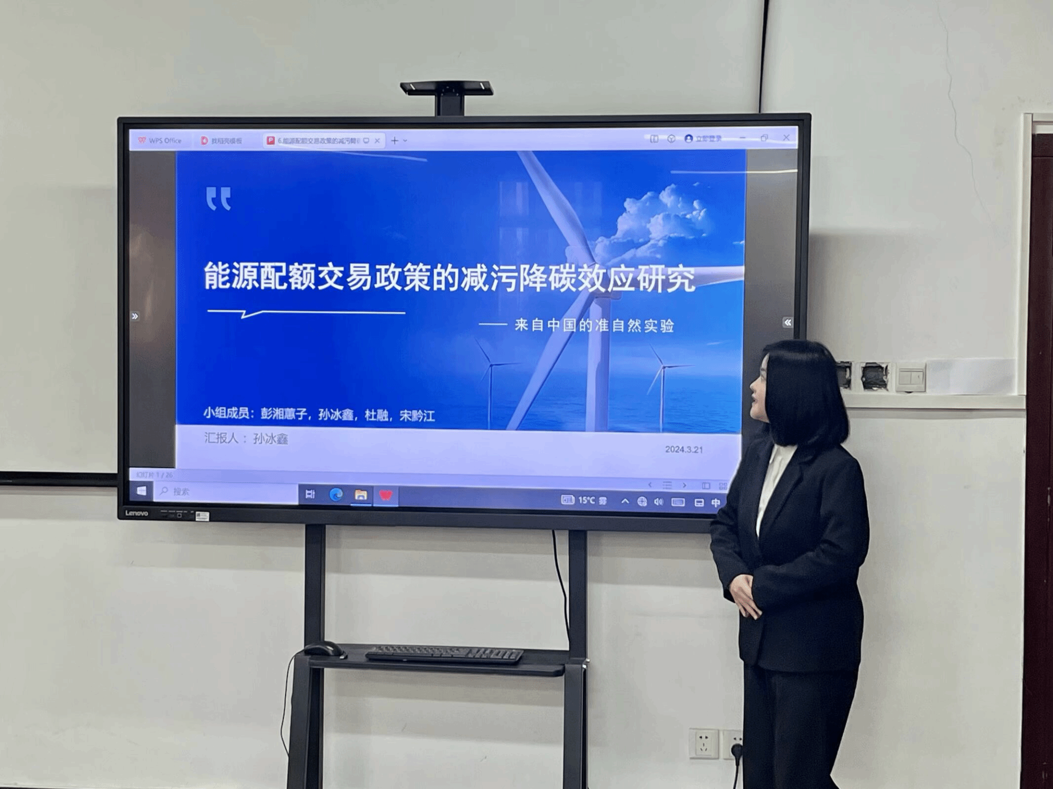 此次学术论坛以“能源经济”为主题,余凤鸣、周瑾怡、孙冰鑫、白佳丹、安佳怡五位主讲人分别围绕“金融科技的碳减排效应”“绿色金融改革”“能源配额交易政策”“能源结构转型”“光伏发电技术”等课题,汇报了本团队的研究成果,就团队的研究内容作分享交流。