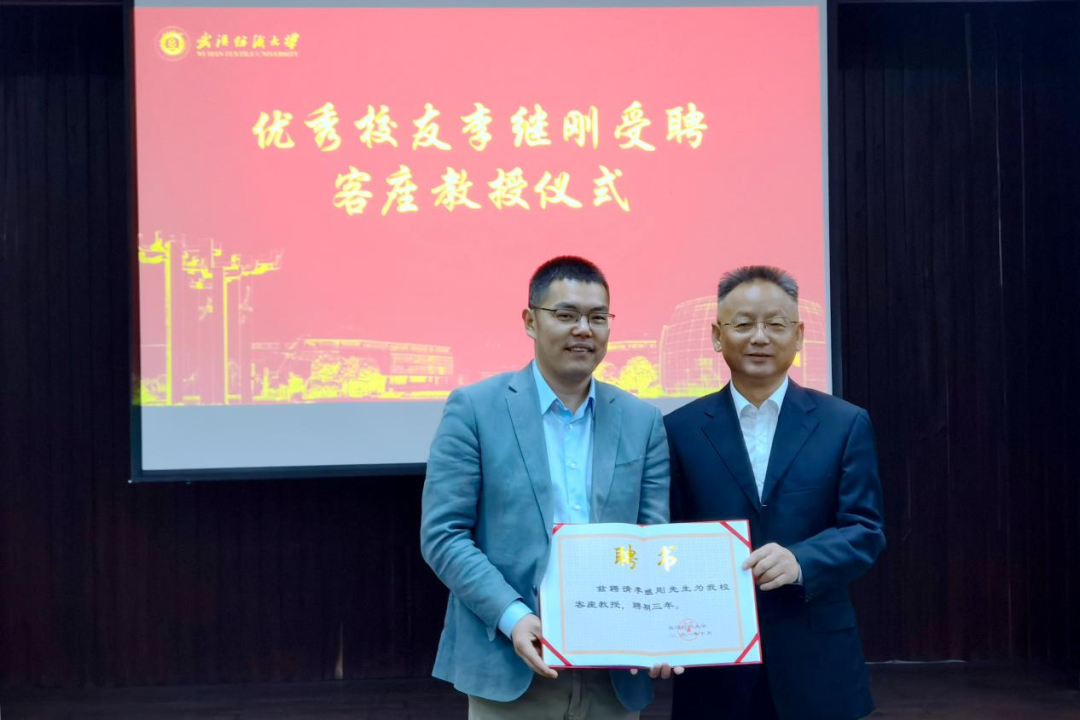 仪式上,我宣读了《关于聘任李继刚为我校客座教授的通知》,并简要介绍了李继刚校友的基本情况。指出,聘请客座教授是我校推进开放办学,深化校企合作,推动学校发展的重要举措,是落实学校人才强校战略、师资队伍建设工作的重要组成部分。希望李继刚教授常回母校看看,号召大学生向李继刚学长学习,更加坚定纺大自信,将纺大精神发扬光大。