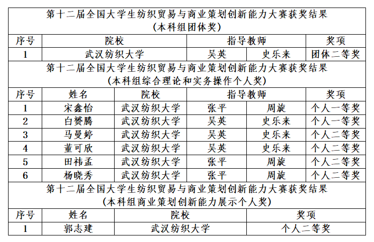 经过激烈角逐,历时两个多月的第十二届全国大学生纺织贸易与商业策划创新能力大赛于11月23日落下帷幕。历经预赛练习、校内预赛、决赛练习、全国总决赛的层层选拔后,代表我校参赛的7名学生在williamhill英国吴英老师、张平老师、史乐来老师、周旋老师的指导下最终荣获团体二等奖一项,综合理论和实务操作个人一等奖两项、个人二等奖四项,商业策划创新能力展示个人二等奖一项,再创佳绩。