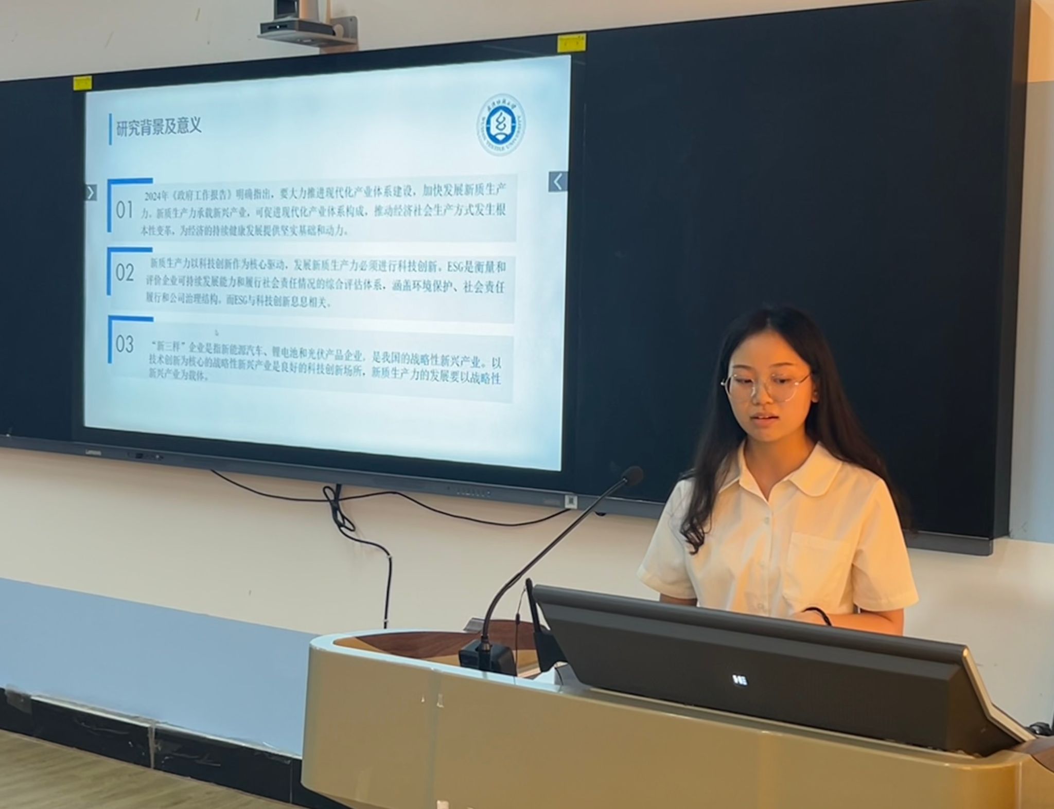 论坛上,四名主讲人基于各自的研究方向,从不同的角度和层次向老师和同学们分享最近的学术研究和创新竞赛成果。陈香同学以“新三样”上市公司为例,进一步分析ESG发展对企业新质生产力的影响;马瑞雪同学展示今年暑期开展的关于怀宁蓝莓产业赋能乡村振兴的三下乡社会实践活动;刘星雨同学通过介绍其参加商业精英挑战赛的进度过程向同学们分享品牌策划竞赛的成功经验;周娜同学提出绿色金融对全要素能源效率的影响及空间效应研究。每位同学在各自不同的角度对自己的学术和竞赛成果进行阐述,内容充实,条理清晰,深入浅出,充分展现出我院研究生的学术实力和科创水平。