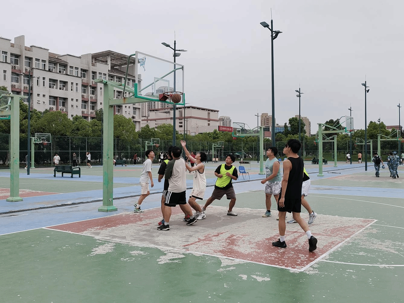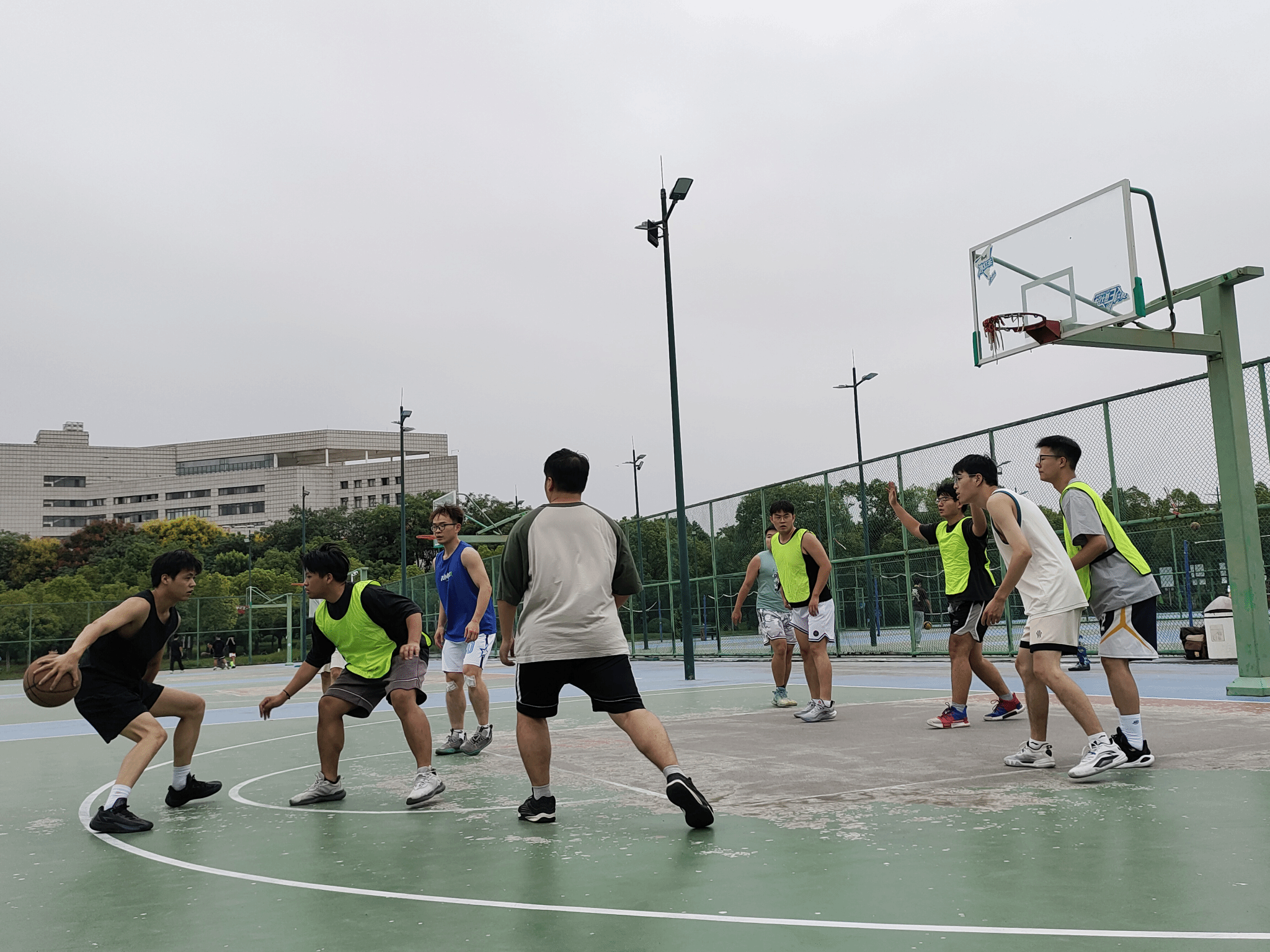 观众席上,全体研一新生同学的加油声、呐喊声此起彼伏,为两支队伍的每一次得分热烈喝彩,篮球场内洋溢着青春热血与团结友爱的浓厚氛围。比赛过程中,双方比分交替上升,攻防节奏紧凑,充分展现了研究生群体积极向上的竞技风采与永不言弃的拼搏精神。