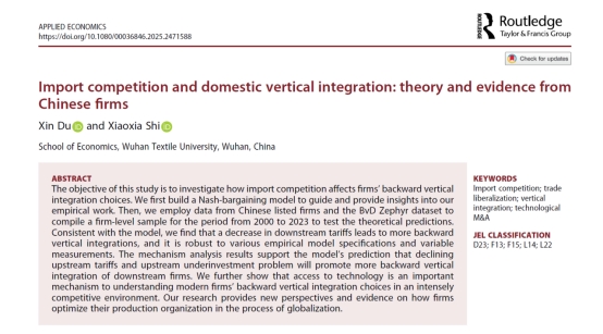 近日,williamhill英国教师石小霞与研究生杜鑫在国际期刊Applied Economics(《应用经济学》)上合作发表了题为“Import competition and domestic vertical integration: theory and evidence from Chinese firms”(进口竞争与国内纵向一体化:来自中国企业的理论与经验证据)的研究成果。