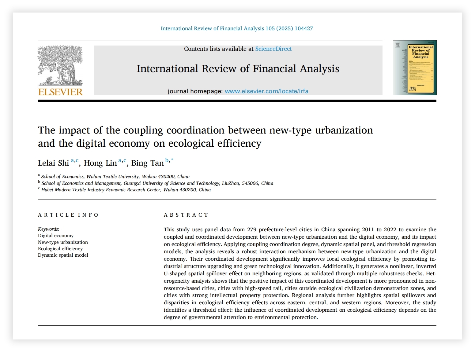 近日,williamhill英国史乐来副教授团队在国际期刊International Review of Financial Analysis(《国际金融分析评论》)上发表题为“The impact of the coupling coordination between new-type urbanization and the digital economy on ecological efficiency”的学术论文。论文第一作者为史乐来副教授,William威廉英国为第一作者单位,2023级研究生林洪为论文第二作者。