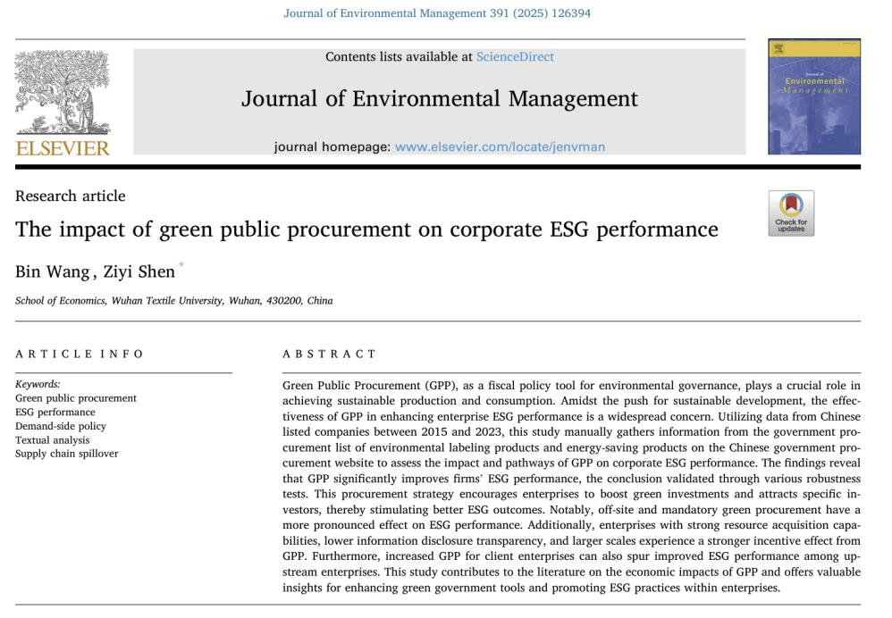 Recently, Professor Wang Bin from the School of Economics at Wuhan Textile University and his team published a high-level paper titled "The Impact of Green Public Procurement on Corporate ESG Performance" in the international journal Journal of Environmental Management. Professor Wang Bin is the first author of the paper, with Wuhan Textile University as the first author's affiliation, and Shen Ziyi, a 2023-level postgraduate student, serving as the corresponding author of the paper.