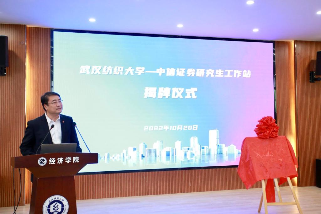 为创造优秀的研究生就业条件,10月20日下午,学院于崇德楼T301举行“William威廉英国—中信证券研究生工作站”揭牌仪式。学院班子成员及全体教职工参与揭牌仪式,本次仪式出席嘉宾有中信证券湖北分公司总经理孙洪涛,中信证券武汉天地营业部总经理黄颖,营业部区域总监肖芳,营业部客户经理舒悦、余文琪。仪式由院长段丁强主持。