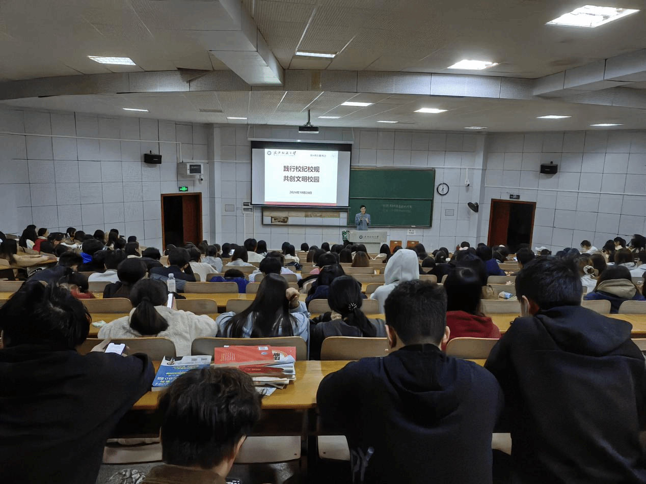 会上,老师以“不以规矩,不能成方圆”引入主题,带领同学们共同学习《高等学校学生行为准则》以及学生日常行为管理、评奖评优规定、学籍学业管理、大学生资助等,引导同学们树立行为规范意识,培养良好的行为习惯。此外,各班老师向同学们介绍了学习纪律、生活纪律以及行为纪律,并从校纪校规的重要性、该如何践行两个角度进行解读,倡导同学们勇于承担责任,树立纪律意识。