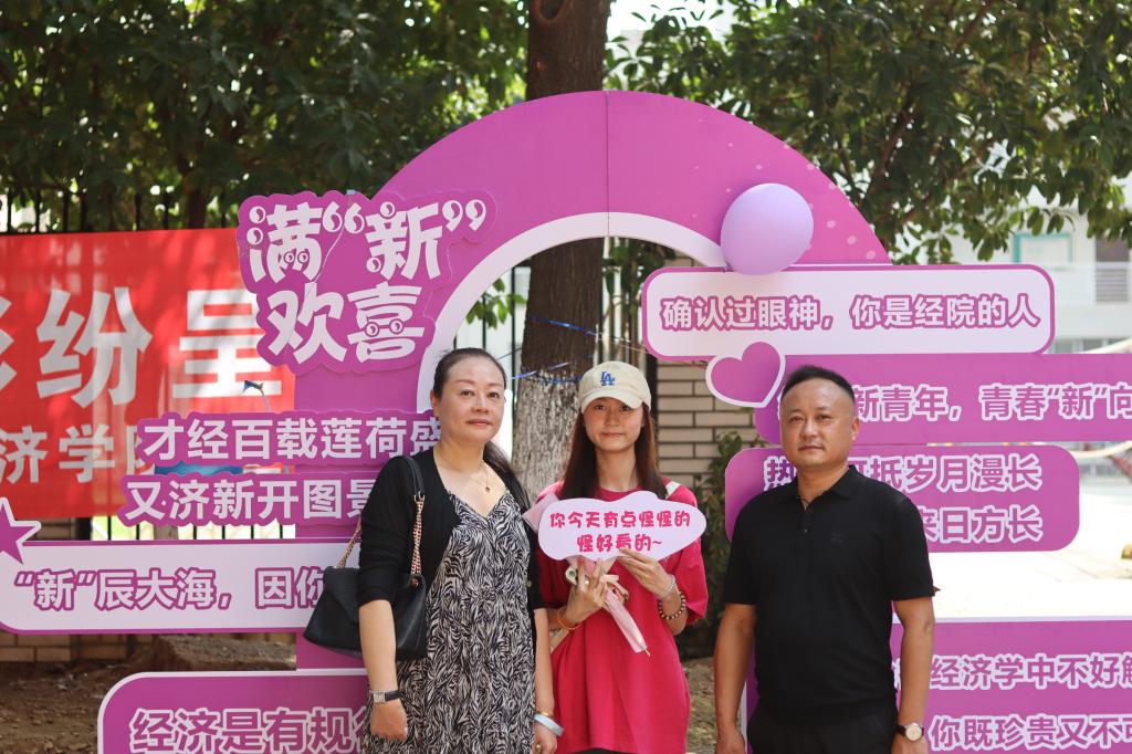 在迎新点,学院特意制作了迎新打卡墙,新生手持“你好经院”“要做经院最亮的那颗新星”等手牌与亲人合影留念,留下步入大学的青春瞬间。照片经由学院新闻中心专业摄影后发放至群内,由新生自主“认领”,留下自己在纺大的第一张影像。