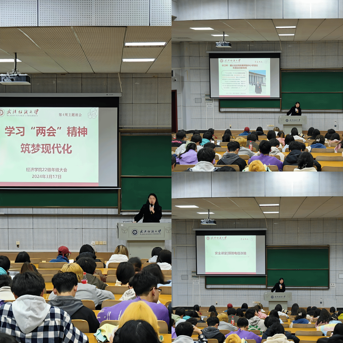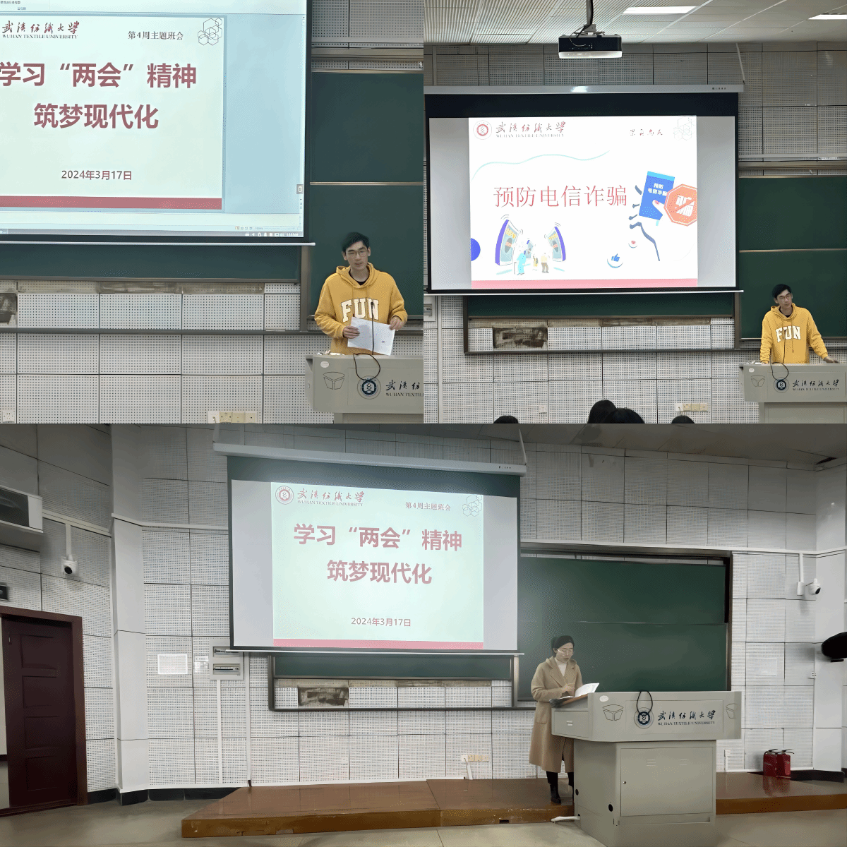 会上,师生共同学习两会新词热词,关注两会教育动态,畅谈感想体会和对美好未来的期盼。老师们结合近期各种安全事故案例,重点强调用水用电安全、火灾防范以及提高防诈防骗意识的重要性,以提高广大学生消防安全意识和自防自救能力,切实守护好人身财产安全。