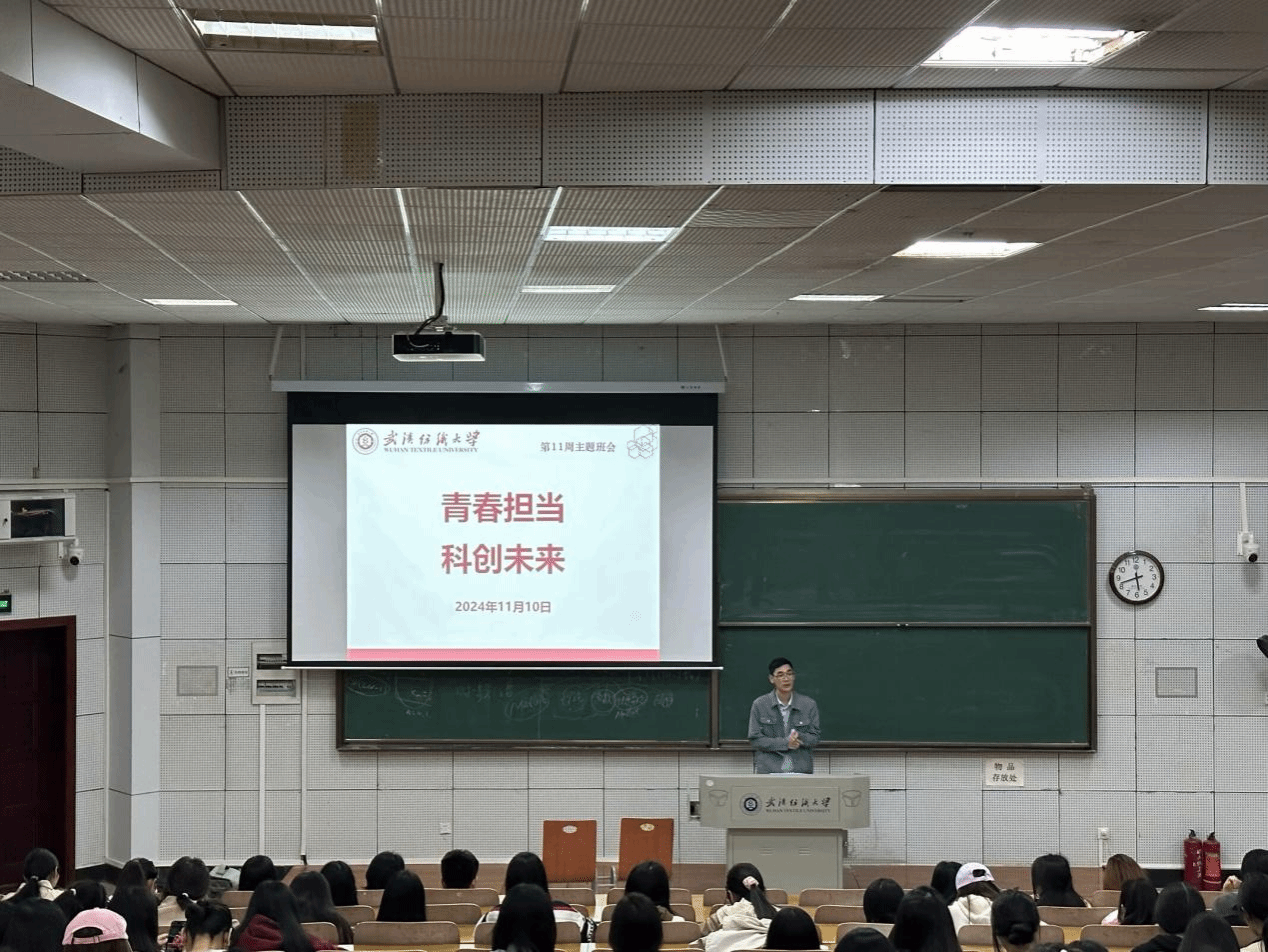 会上,各年级辅导员、老师带领同学集中回顾了徐卫林院士参加的《开讲啦》。该节目中,徐卫林院士以一场精彩的演讲展示了纺织科技的“黑科技”,从能够抵御1300℃烈焰的神奇布料到能让手机信号瞬间消失的薄布,徐院士与主持人撒贝宁的对话和与现场观众的互动,不仅展现了纺织领域的无限魅力,也向全国观众展示了我校科研成果。