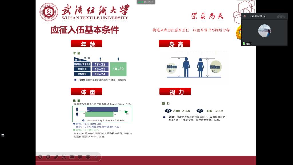 会议伊始,辅导员、班主任就2023年春季大学生征兵入伍相关工作进行详细讲解,从征兵入伍基本信息、大学生参军特别优惠政策、军营生活、征兵防诈骗等四个方面鼓励大学生积极响应征兵号召,并动员同学们积极参与。