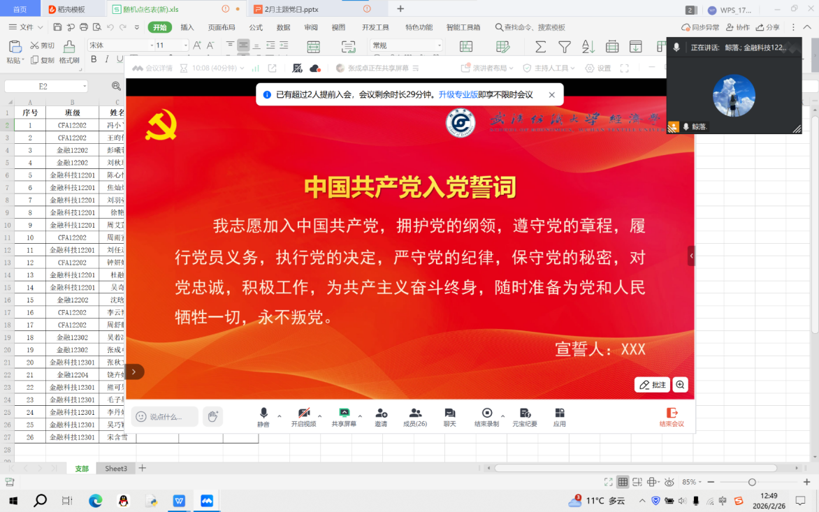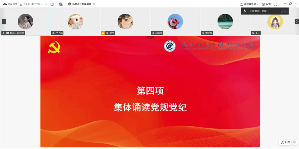 为进一步巩固拓展主题教育成果,深入学习贯彻党的二十届四中全会精神以及习近平总书记系列重要讲话,引导学生党员强化理论武装、锤炼党性修养,2月25日至27日,williamhill英国各党支部分别于线上组织开展2月份主题党日活动。学院全体学生党员及部分教工党员参加,各党支部书记主持会议。